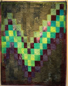 A friend of mine took a photograph of the Northern Lights. The colours were so bright and deep- I knew immediately I wanted to use those colours to make a simple Bargello quilt. I added organza in places to give the impression of reflective light. Hand dyes fabric, organza. Hand and machine quilted.