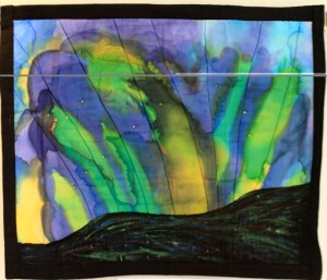 Hand painted silk and is inspired by a description of the Northern Lights as seen by my son.