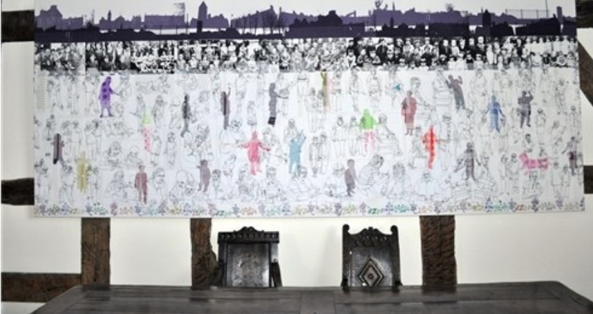 The Ordsall Hall, Salford commission hangs in the 16th century Great Hall. It consists of screen-printed photographs of groups of people living in the Ordsall area in the 1930’s running alongside a printed Ordsall skyline. Below this there are stitched drawings of people from the local communities in the area surrounding the hall.