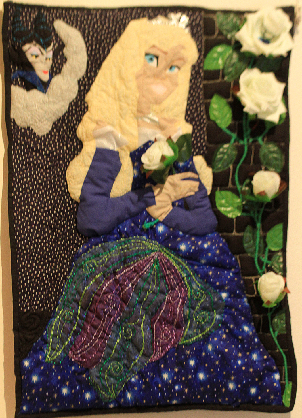 As soon as I heard the theme Princess Aurora popped into my head. I did a mash up of a lot of techniques: the face is foundation pieced and the body is needle turn applique. I also gave hand embroidery a go, my first attempt. I wanted it to be 3 dimensional so I added extra wadding behind her and the flowers.