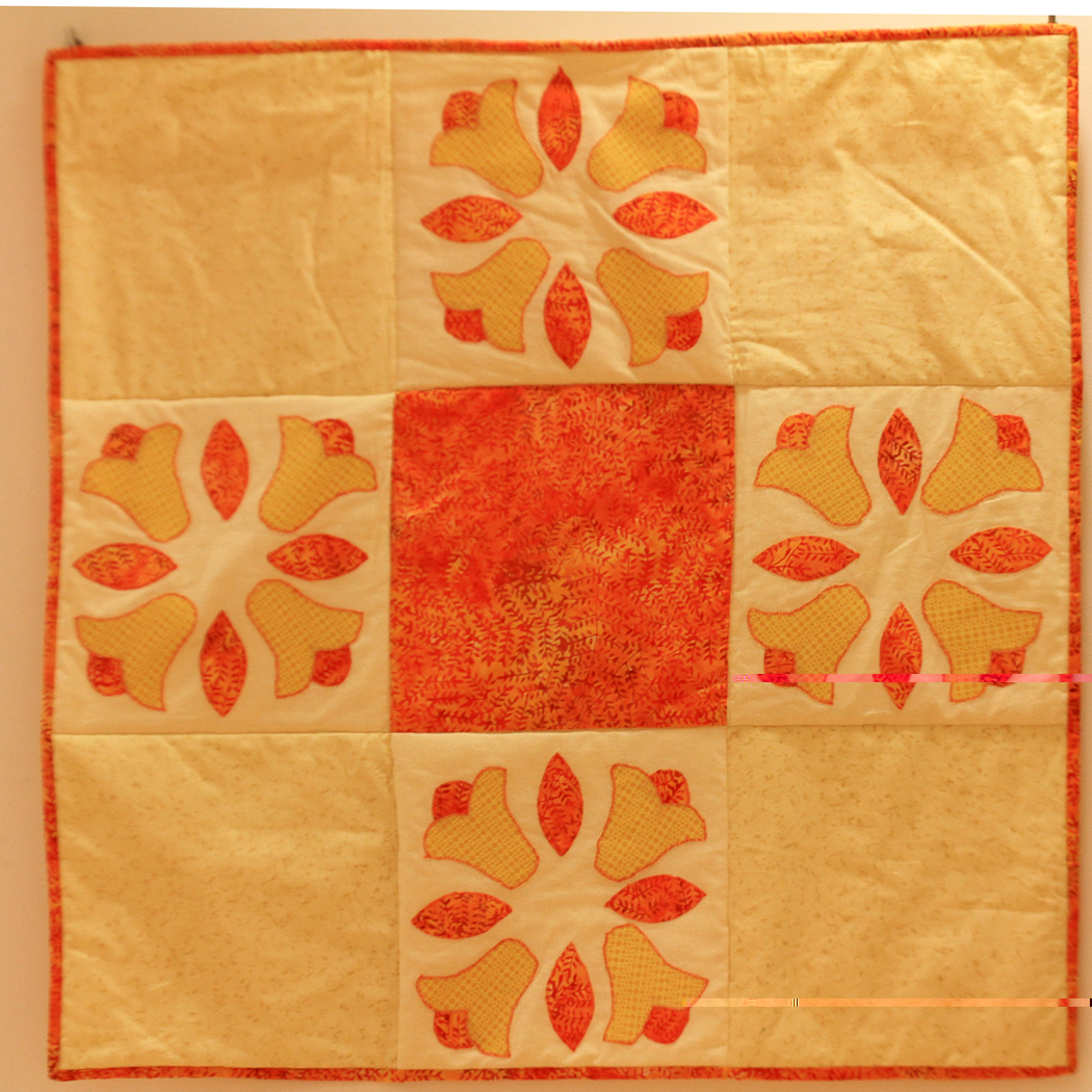 This is my first quilt for exhibition. It was inspired by a pattern in a quilt magazine. I used cotton fabric and machine pieced and appliqued the design