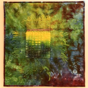 The colours in the central square inspired my thought on Aurora. The squares were hand sewn combining various white materials and white threads. It was then painted with procion dyes using techniques learned at a workshop with Ruth Issett. The quilting is hand stitched running stitches of various sizes. Background is hand dyes fabric purchased at Festival of Quilts several years ago.