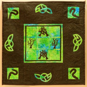 The carved initials of poet W.B. Yeats and dramatist J.M. Synge on the “Autograph Tree” in Lady Gregory’s Coole Park. They were central to our early 20th Century Literary Revival, our Celtic Dawn. Machine pieced and quilted. Cotton and synthetic fabrics.