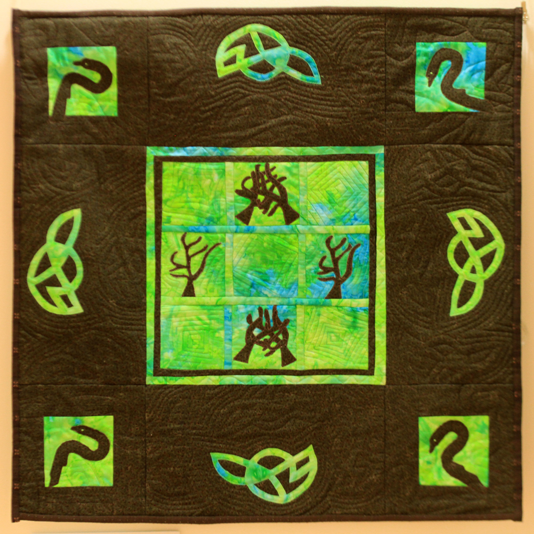 The carved initials of poet W.B. Yeats and dramatist J.M. Synge on the “Autograph Tree” in Lady Gregory’s Coole Park. They were central to our early 20th Century Literary Revival, our Celtic Dawn. Machine pieced and quilted. Cotton and synthetic fabrics.