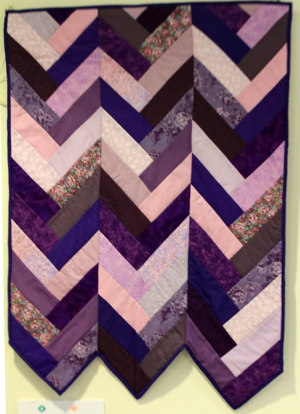 Abstract strip quilt created in a variety of purple fabrics.