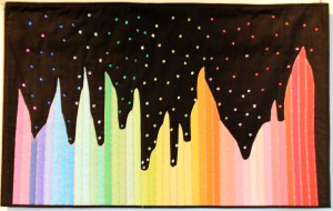 I am fascinated by space and the wonders out there. Recently, I was looking through the NASA.GOV website. I was struck by the images of the Northern Lights taken from the International Space Station. I started thinking that the colours must be much more vibrant in space imagining that the parts bleeding away into the ether are twinkling brightly into the distance. Cotton fabric , machine and hand quilted with sequins and beads.